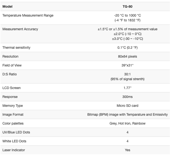 | Temperature Measurement Range | -20 °C to 1000 °C (-4 °F to 1832 °F) |